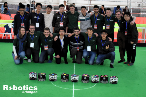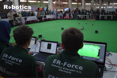 13′: Es gibt eine gefährliche Situation an unserem Strafraum, aber unsere Roboter wehren gut ab.