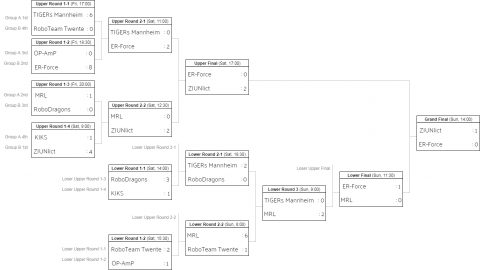 Das für uns teils überraschende Ergebnis von 0:2 gegen ZJUNlict aus China resultierte in unserem leider letzten Spiel im Upper Bracket. Uns war von vornherein klar, dass wir nicht souverän gewinnen würden. Doch die Hoffnung auf ein Unentschieden gegen die (hardware- und softwareseitig) extrem starken Chinesen blieb lange bestehen. Wir konnten gut verteidigen, doch am Ende reichte es nicht und wir rutschten in das Lower Bracket ab. Trotzdem war uns hiermit schon der dritte Platz sicher und wir freuten uns über eine jetzt schon bessere Platzierung als letztes Jahr in Kanada (Platz 4).