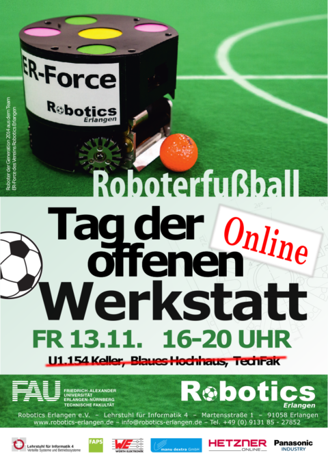Wie jedes Jahr nehmen auch wir an dem Hochschulgruppentreffen am Mittwoch, dem 16.10.2024 am Roten Platz der TechFak teil. Dort werden wir den ganzen Tag über einen Informationsstand haben, an welchem wir allen Interessierten von Robotics und dem RoboCup erzählen. Außerdem werden wir ein kleines Spielfeld aufbauen, auf welchem man die Roboter selbst manuell fahren lassen kann.
