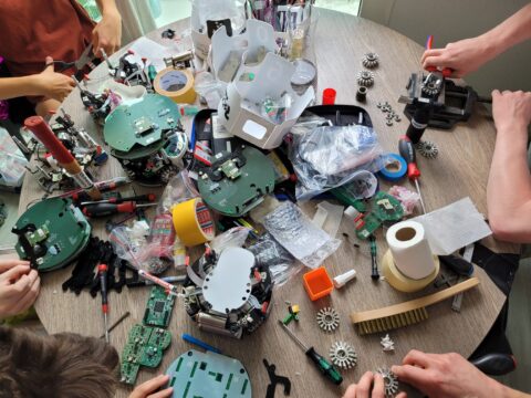 Freshly equipped with T-shirts and hoodies, we immediately dive into the important tasks: cutting out colored papers for the top of our covers (for the why, see this explanation), finalizing and setting aside the robots.