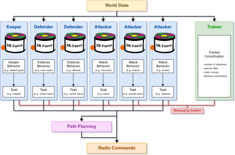 - The trainer is responsible for global decisions, like how many attackers do we need, which robot is allowed to approach the ball or which opponent has to be defended the most. The trainer also communicates with the robots via the messaging system.