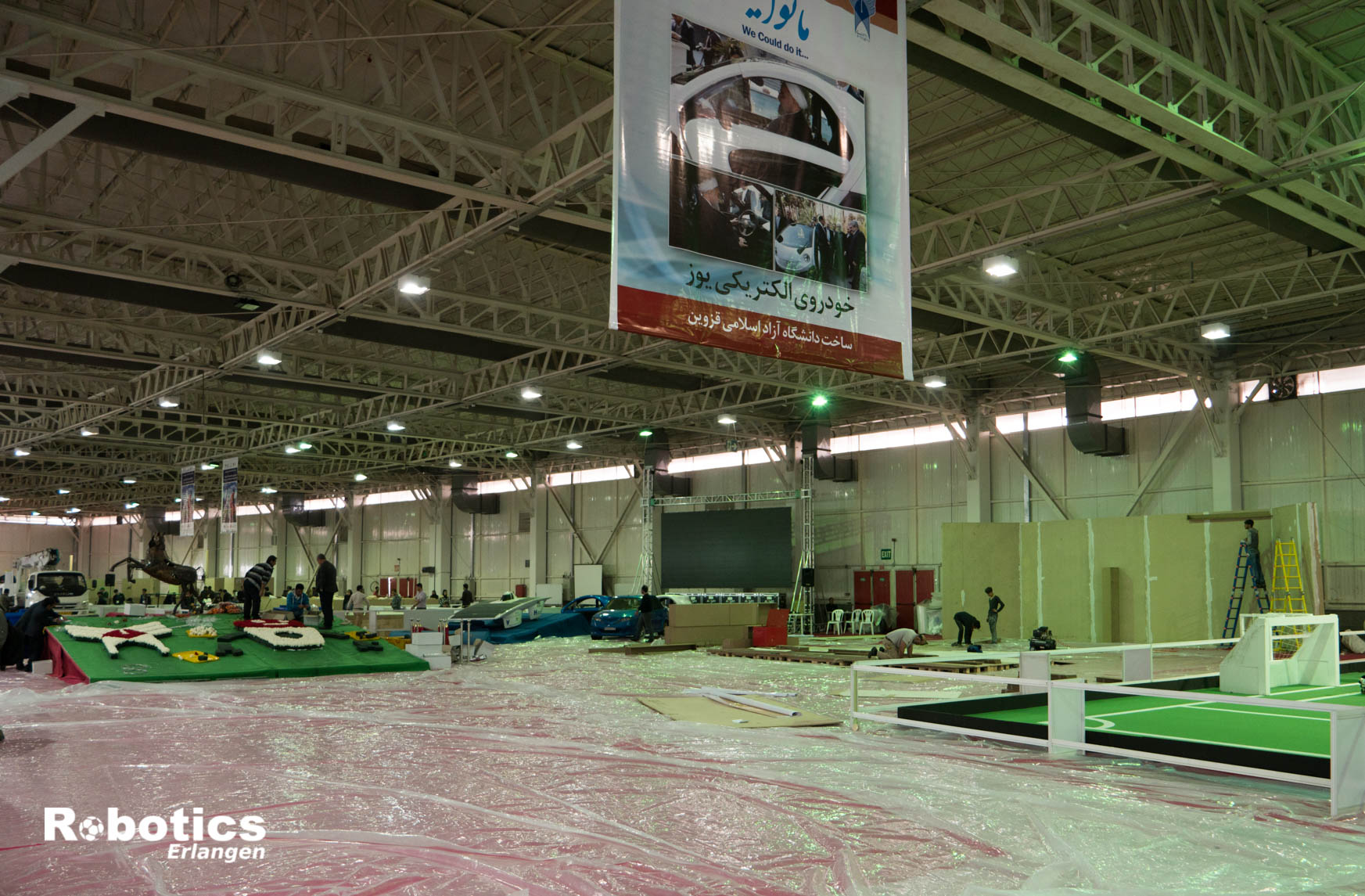Noch wird an vielen Stellen in der Messehalle gebaut und auch in unserer Liga sind die Spielfelder noch nicht ganz fertig, aber wir sind optimistisch, dass wir innerhalb der nächsten Stunde unsere Roboter auch auf dem Feld testen können und auch ein Testspiel bestreiten bestreiten können, um die neuesten Änderungen in unserer Strategie zu testen.