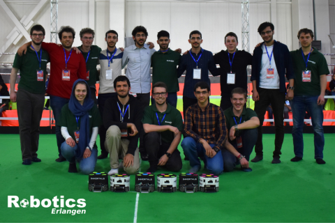 9′: Ein gelber Roboter rammt uns die ganze Zeit, er fährt immer wieder gegen unseren Roboter. Wir kriegen einen Freistoß.